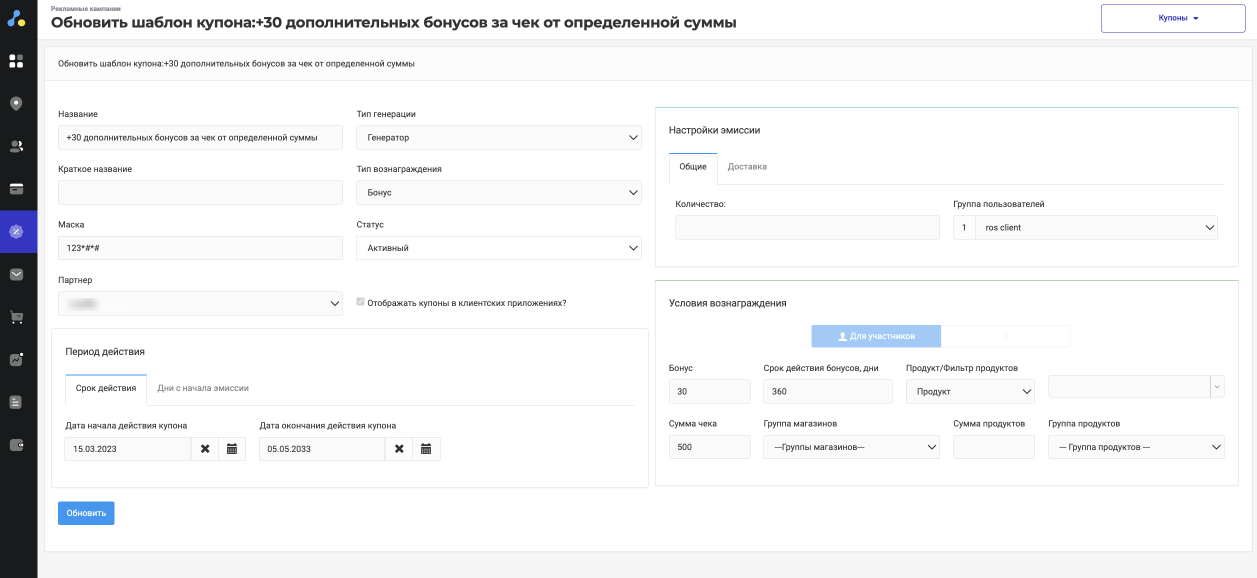 Полученный купон можно использовать, только став участником программы лояльности. Купоны расширяют возможности по вовлечению в программу новых клиентов. Инструмент позволяет выбрать тип генерации, период действия купона, тип вознаграждения, настройки эмиссии, группу пользователей, срок действия бонусов, условия вознаграждения и многое другое.