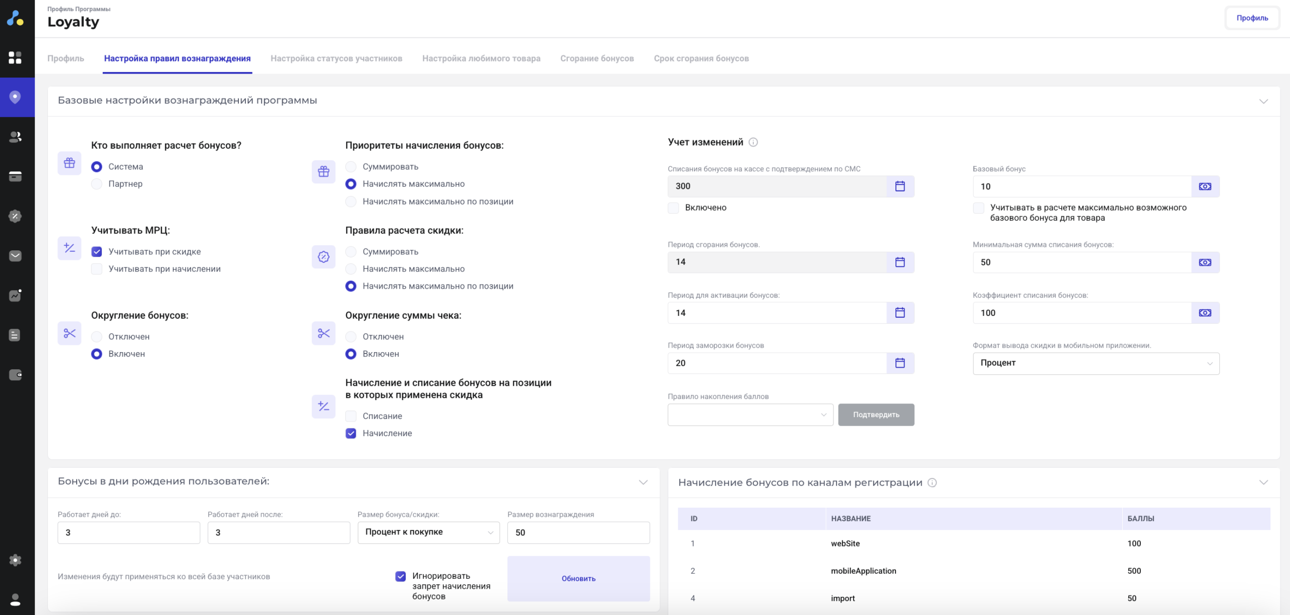 Дают возможность установить: приоритеты начисления бонусов, принцип округления бонусов и суммы чека, логику сгорания бонусов, период для активации бонусов и многое другое.