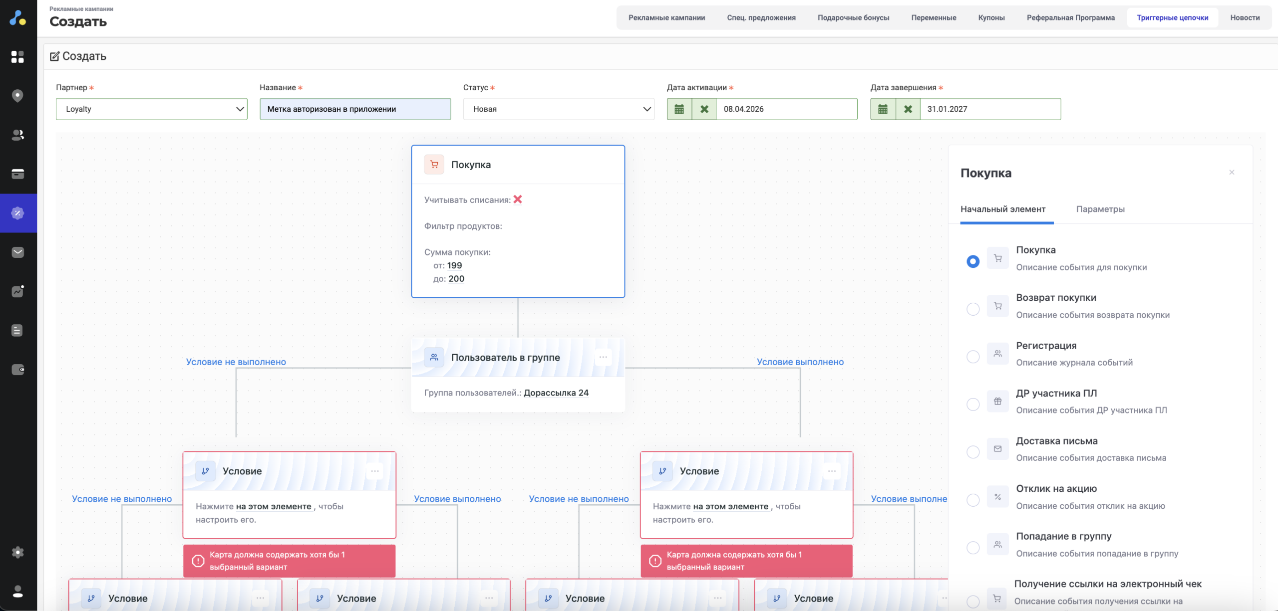 Регистрация в ПЛ, попадание покупателя в определенную группу, совершение определенной покупки, возврат товара, участие в акции, день рождение и прочее.