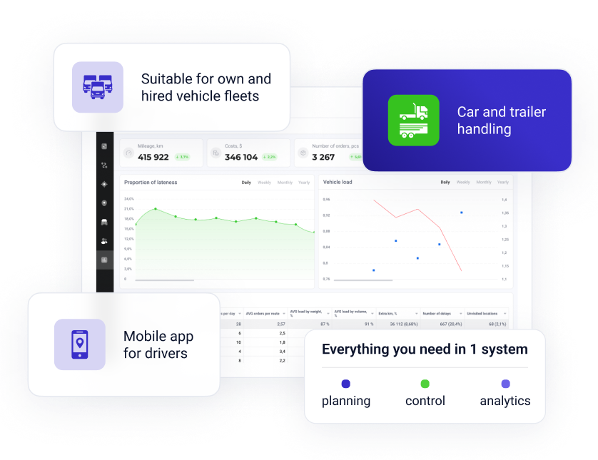 Administration of owned and hired fleet of vehicles. Administration of carriers, drivers and trailers. Create different vehicle profiles to build a route on the map, taking into account the relevant restrictions