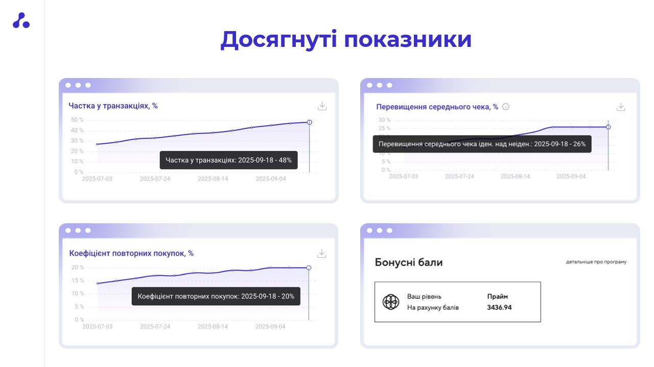 Показник повторних покупок зріс до 20%. Це свідчить про формування ядра постійних клієнтів, які обирають бренд знову завдяки бонусам і персоналізованим пропозиціям.