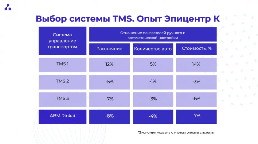 Для выбора TMS системы компания проводила тендер, учитывая стоимость и заявленные функции. Проработав около года с решением, которое в теории удовлетворяло все потребности компании, был проведен анализ, который показал что стоимость доставки наоборот выросла. Поиски TMS начались сначала. Было протестированы еще 3 системы, среди которых и ABM Rinkai, с результатами вы можете ознакомиться на изображении ниже.